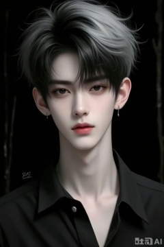 this is a digital portrait of a young, androgynous individual with pale skin and striking black and gray, tousled hair, the person has a slender neck and a delicate, symmetrical face with soft, pink lips and dark, almond-shaped eyes that give a slightly melancholic expression, they are wearing a black, button-up shirt with a small, silver button near the collar, a small, silver earring is visible in their right ear, the background is dark and indistinct, with faint, vertical lines that add a subtle texture, the overall style is realistic with a slightly moody, ethereal quality, the artists watermark, slee mo, is in the bottom left corner