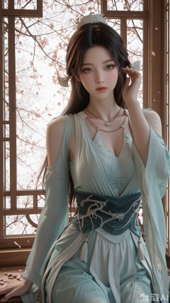 1woman, solo, ornament, SY clothes, breasts, no eye shadow, hair_tucking, cowboy_shot, even lighting, wind blows through hair, looking at viewer, very awa, Pink Petals Scattered and Open central window background,