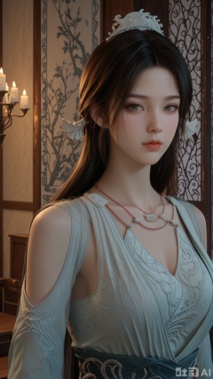 1woman, solo, ornament, SY clothes, breasts, no eye shadow, upper_body, even lighting, looking at viewer, very awa, room background,