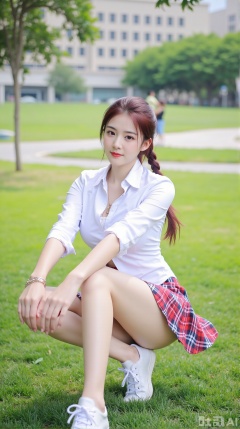 (masterpiece,best quality:1.23),schoolgirl character, jk style outfit, kneeling pose, braided hair, simple white blouse, elegant plaid skirt with lace trim, pristine white sports shoes, elegant pendant, delicate chain bracelet, beautifully long legs, defined waist, on a manicured lawn, grand university building in distance, atmospheric light, depth of field, vivid colors,(huge breasts, full breasts:2.99),,Xaili2,XyunxiaoYH5,XlinziyueXZ,XtuliH,Xbigbreasts,XMedusaQueen,Xnanhangzhifu,Xjkgeziqun,Xbingbing