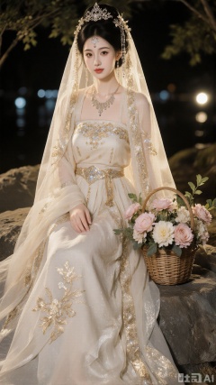 The image is a portrait of a young woman wearing a traditional Chinese wedding dress. She is sitting on a rock with a basket of flowers in front of her. The woman is wearing a long, flowing white dress with intricate gold embroidery and a veil covering her face. Her hair is styled in an elegant updo with a tiara on top. The background is blurred, but it appears to be an outdoor setting with trees and lights. The overall mood of the image is romantic and dreamy.