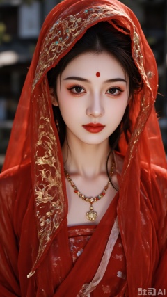 The image is a portrait of a young woman wearing a traditional Indian outfit. She is wearing a red and gold headpiece with intricate designs and patterns. The headpiece is made of a red fabric with gold accents and has a large hood that covers her head. The woman is also wearing a gold necklace and earrings. She has long dark hair and is looking directly at the camera with a serious expression. The background is blurred, but it appears to be an outdoor setting with buildings and trees visible. The overall mood of the image is elegant and regal.