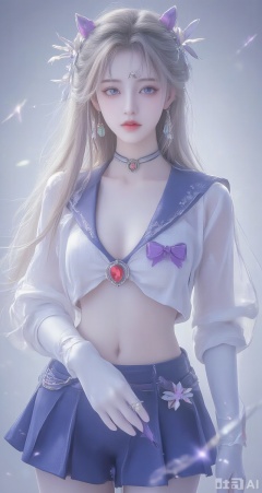 lvjing,baoshi,long hair,blonde hair,jewelry,earrings,blue eyes,ring,lips,red_lips, 1girl,sailor senshi uniform,solo,jewelry,skirt,gloves,earrings,blue skirt,white gloves,sailor collar,bow,breasts,choker,elbow gloves,magical girl,back bow,covered navel,heart,pleated skirt,looking at viewer,brooch,purple bow,heart brooch,red choker,circlet,miniskirt,closed mouth,large breasts,collarbone,red gemstone,tiara,cowboy shot,simple background,gradient background,close-up details,outstanding style,adding a touch of dimension to your images without compromising details,close-up,