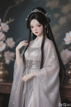 BJD_style,1girl, solo, long hair,The image depicts a highly detailed and intricate doll or figurine. The figure has long, dark hair adorned with ornate hairpins and beads, and a flowing black and gray robe with silver embroidery. The face is delicately painted with subtle makeup, including red lipstick and defined eyebrows, and there is a decorative mark on the forehead. The overall aesthetic is elegant and traditional, with a focus on fine craftsmanship and attention to detail. The background is blurred, ensuring that the figure remains the central focus of the image.