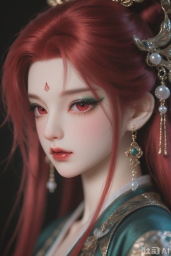 BJD_style,1boy, solo, long hair, looking at viewer, hair ornament, red eyes, jewelry, upper body, red hair, earrings, blurry, lips, makeup, facial mark, portrait, eyeshadow, forehead mark, red lips.