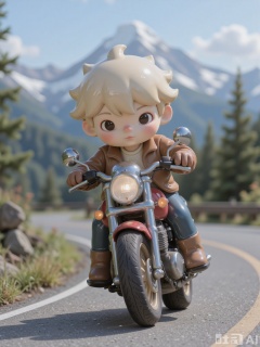 KATC, A adventurous, daring boy with short, spiky blonde hair and a leather jacket rides a motorcycle through a mountain road. He wears a helmet and gloves, speeding around curves as the wind whips through his hair. The mountains are majestic, with snow-capped peaks and a clear blue sky above.