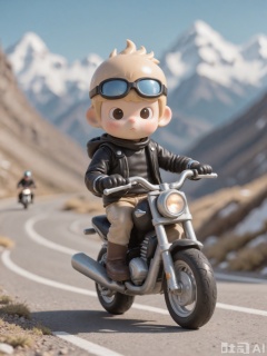 KATC, A adventurous, daring boy with short, spiky blonde hair and a leather jacket rides a motorcycle through a mountain road. He wears a helmet and gloves, speeding around curves as the wind whips through his hair. The mountains are majestic, with snow-capped peaks and a clear blue sky above.
