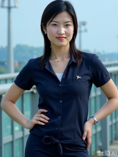 In 8K HD shot, the 28-year-old flight attendant stood at the entrance of the bridge, with a dark blue uniform jacket (with a white V-neck inside, two buttons open at the collar of the jacket), the cleavage was slanted by the airport's natural light, the elastic fabric of the base shirt fits the body, the groove lines are smooth and clear, and the shadows on the edges of the jacket form a sense of layering of depth and shade on the chest. She raised her hand to signal the passenger, slightly lifted her right arm to tighten the hem of the jacket, revealing the connection between the waistline and the chestline. She tied a bow between the neck, and the end was hanging from the side of the groove, with a bright and professional smile. The background is the apron outside the glass of the corridor bridge. The skylight casts a light blue spot on the chest through the glass. The metal badge of the uniform echoes the highlights between the grooves, and the aura is capable and gentle.