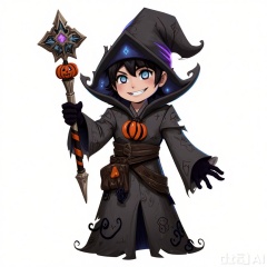 In the digital illustration, the boy magician is fully pictured, wearing a dark gray robe, the surface of the robe is covered with delicate magic runes, slightly torn at the cuffs, and a small number of black thin tentacles are revealed at the edge of the crack. The tentacles are slightly squirming but not obvious. The magic hat is high and pointed, with a blue-purple magic halo, and a small pumpkin pendant is decorated with the top of the hat, which is hung on the side of the hat tip. A dark belt is tied around her waist, and an orange-black striped pumpkin ornament is both mysterious and playful. The magician holds a complexly carved staff in his left hand, with a glowing gem embedded at the top of the staff, and the body of the staff is surrounded by tiny magic symbols. The boy's face is three-dimensional, with deep eyes, thick and natural eyebrows, smiley corners of his mouth, and black hair