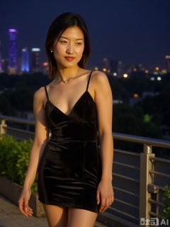 ELLE magazine style high-definition blockbuster, shot by 8K Hasselblad camera, close-up of the upper body of a 30-year-old Asian model, wearing a black velvet deep V-sling skirt (the hem is irregularly cut, with back exposed to the waistline), the cleavage is double outlined by the warm yellow light on the terrace and the cold light of the city night scene - the velvet fluff is golden brown in the light, the shadow between the grooves rises and falls with breathing, and the shoulder and neck lines form geometric acute angles with the collarbone. She leaned against the terrace railing, lightly held the metal handrail with her right hand, and naturally drooped with her left hand. She wore an emerald ring on her fingertips, looking at the camera with a half-closed look, and a smile on the corners of her lips. The background is blurry skyscraper lights (blue purple spots are gradient background), the skirt is 5cm curved by the evening breeze, the folds where the velvet contacts the skin are matte white, the overall tone is high saturation but harmonious (black skirt + warm skin + cool background), which is in line with the restraint and sexy of ELLE's fashionable editorial.