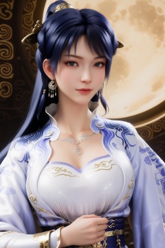 score_9,score_8_up,score_7_up,8k,3d model,<lora:姬紫月_重置2_Pony:0.8>,1girl,purple hair,solo,black hair,blue hair,hair ornament,ponytail,long hair,earrings,necklace,chinese clothes,wrist guards,robe,belt,This is a highly detailed CGI rendering of a young Asian woman with fair skin and long,dark blue hair adorned with golden hairpieces. She wears a traditional blue and white embroidered robe with intricate patterns,revealing a hint of cleavage. Her expression is serene,with delicate features and soft makeup. She has dangling earrings and a silver necklace with a crescent moon pendant. The background is a dark,textured stone wall,adding a mysterious atmosphere. The overall style is realistic with a slight fantasy element,reminiscent of Japanese anime or video game character design.,looking at viewer,front view,female,(mature_female),mature,collarbone,large breasts,curvy,glamor,puffy breasts,pointy_breasts,(Ivory_skin),(fair_skin),(white_skin),body blush,full moon,simple_background,black_background,