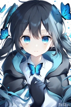 butterfly, bug, 1girl, solo, blue_butterfly, gloves, long_hair, black_gloves, black_hair, twintails, blue_eyes, white_background, upper_body, shirt, looking_at_viewer, simple_background, hood, hair_between_eyes, collared_shirt, white_shirt, long_sleeves, hand_on_own_chest, ahoge, hood_down, closed_mouth