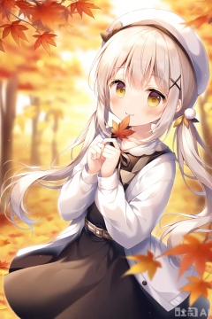 1girl, autumn leaves, solo, dress, maple leaf, hair ornament, long hair, leaf, black dress, hat, twintails, smile, holding, blurry, looking at viewer, x hair ornament, long sleeves, autumn, white headwear, yellow eyes, sleeveless dress, holding leaf, closed mouth, open clothes, pinafore dress, sleeveless, white hair, blurry foreground, beret, blush, depth of field, low twintails, belt, open cardigan, blurry background, cardigan, outdoors, sidelocks, standing