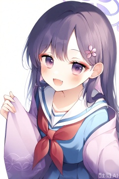 solo, 1girl, long_hair, purple_eyes, purple_hair, red_neckerchief, skin_fang, halo, neckerchief, skirt, white_sailor_collar, fang, hair_ornament, simple_background, white_background, haori, flower, open_mouth, japanese_clothes, pleated_skirt, hair_flower, purple_halo, pink_flower, sailor_collar, school_uniform, serafuku, smile, blush, blue_skirt, looking_at_viewer, makeup, red_eyeshadow, eyeshadow, long_sleeves