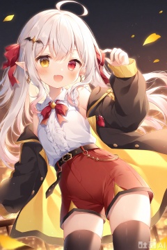 1girl, solo, shorts, heterochromia, shirt, jacket, long_hair, red_bow, white_hair, fang, sleeves_past_wrists, sleeveless, sleeveless_shirt, smile, red_eyes, center_frills, yellow_eyes, pointy_ears, open_clothes, black_jacket, bow, red_shorts, open_jacket, earrings, jewelry, white_shirt, looking_at_viewer, frills, off_shoulder, long_sleeves, hair_ornament, short_shorts, bare_shoulders, blush, :d, thighhighs, very_long_hair, collared_shirt, ahoge, open_mouth, belt, virtual_youtuber, hair_between_eyes, ribbon