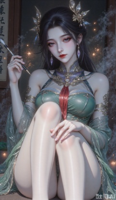 Realistic illustration,melting,HG2512,1girl,dusk (arknights),black hair,solo,barefoot,pointy ears,dragon horns,red eyes,colored skin,green skin,bare legs,red necktie,dragon tail,paintbrush,jewelry,very long hair,dragon girl,holding brush,looking at viewer,lying,full body,earrings,hair over one eye,calligraphy brush,streaked hair,on back,holding paintbrush,scroll,beads,green hair,from above,masterpiece,extremely delicate and beautiful,best quality,artistic style,fashionable,cool and fashionable,masterpiece,best quality,good quality,very aesthetic,A shot with tension,impactful picture,offcial art,colorful,splash of color,movie perspective,masterpiece,facing the lens,best quality,very aesthetic,extremely delicate and beautiful,huge filesize,amazing quality,32K UHD,close-up,(solo_focus:1.2),((eyes_focus)),