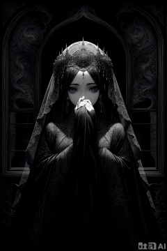 the essence of a woman's face,partially obscured by a black veil. Her eyes,the windows to her soul,are the focal point of this image. They are large and expressive,framed by thick,dark eyelashes that add depth and intensity to her gaze. The veil,draped over her head and covering her mouth,adds an air of mystery and intrigue. A decorative headpiece adorns her forehead,its intricate design adding a touch of elegance and cultural significance. The background is a stark black,providing a stark contrast that accentuates the details of her face and the veil.The woman's position relative to the background suggests she is standing in front of it. The photograph beautifully encapsulates a moment of quiet contemplation and cultural richness., as style