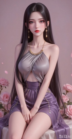 long hair, black hair,purple eyes,legs,long legs,flowers,