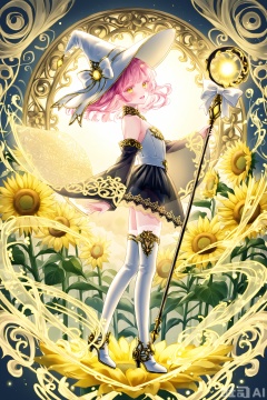 1girl,hat,yellow eyes,solo,thighhighs,staff,pink hair,holding,witch hat,open mouth,smile,white thighhighs,holding staff,leotard,bow,standing,looking at viewer,white headwear,short hair,full body,:d,white leotard,bare shoulders,thigh boots,skirt,hat bow,blush,detached sleeves,white bow,long eyelashes,colored eyelashes,fantasy,black dress,from side,long hair,floating hair,see-through clothes,see-through body,parted lips,mascara,lace,wide sleeves,Sunflower Fields,bioluminescence,Clothes with gold patterns,
