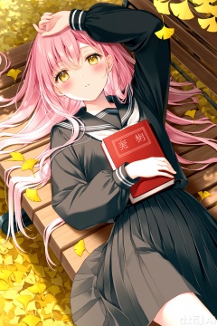 1girl,solo,skirt,pink hair,school uniform,shirt,lying,serafuku,black shirt,on back,blush,long sleeves,long hair,sailor collar,black skirt,black serafuku,pleated skirt,black sailor collar,bangs,looking at viewer,bow,autumn leaves,arm up,hair between eyes,leaf,outdoors,yellow eyes,puffy long sleeves,bench,ginkgo leaf,closed mouth,day,on bench,parted lips,autumn,holding book,