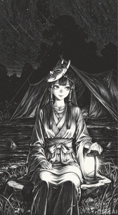 1girl, mask on the head, long eyelashes, lips, traditional clothing, cowboy shot,Sitting on a stone by the stream,  jewelry necklace, charming smile, long hair, hair tube,Complex background, light and shadow effect,In the distance is a tent,