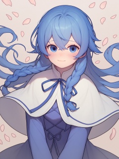 score_10,score_9,score_8_up,score_7_up,1girl,roxy migurdia,blue eyes,solo,long hair,blue hair,smile,looking at viewer,braid,hair between eyes,closed mouth,dress,blush,crossed bangs,capelet,petals,long sleeves,