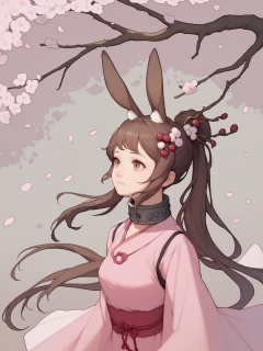 score_10,score_9,score_8_up,score_7_up,1girl,animal ears,rabbit ears,ponytail,solo,brown hair,dress,petals,pink dress,falling petals,upper body,metal collar,hair ornament,long hair,cherry blossoms,branch,closed mouth,