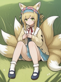 score_9,1girl,suzuran (arknights),fox tail,fox ears,tail,animal ears,fox girl,green eyes,frilled hairband,blonde hair,multiple tails,cat,long hair,long sleeves,hairband,solo,sitting,red ribbon,blue hairband,frills,outdoors,ribbon,holding,cardigan,wariza,shoes,socks,neck ribbon,kitsune,looking at viewer,white socks,skirt,open clothes,head wreath,grass,animal ear fluff,