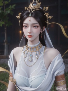 A high-quality digital illustration of a beautiful Asian woman with pale skin and long, dark hair adorned with golden, ornate accessories. She wears a white, sleeveless dress with intricate gold patterns and a high collar, accessorized with a detailed, layered necklace featuring blue gemstones. The background features a blurred, dark outdoor setting with some greenery. The lighting is soft and natural, highlighting her serene, delicate features. The art style is realistic with a slight fantasy touch, showcasing fine details and smooth textures. The image exudes elegance and grace, with a focus on traditional Asian aesthetics.,zichu-YCSN