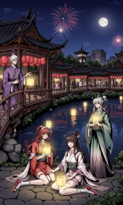 <lora:flux-lora-000010:1>,This digital painting depicts a vibrant nighttime festival scene in an East Asian setting. Four characters, dressed in traditional Japanese attire, gather by a lantern-lit waterway. A man in a purple robe stands on a bridge, while two women in red and white kimonos sit on the ground, holding glowing lanterns. Another woman in a green and white kimono stands on the right. Traditional Japanese architecture with red lanterns and intricate designs fills the background. Fireworks light up the sky, and a full moon hangs above. The water reflects the lanterns and fireworks, adding to the festive atmosphere. The scene is rich in colors, textures, and details, capturing the spirit of a traditional celebration.
