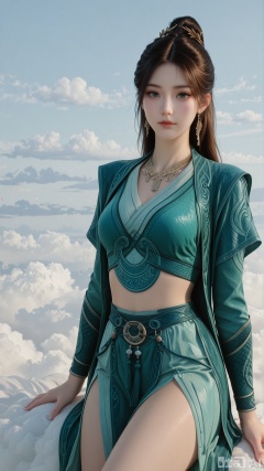 1girl, ornament, solo, MPL clothes, exquisite skin, on cloud, cowboy_shot, looking at viewer, even illumination, very awa, Solid clouds background,