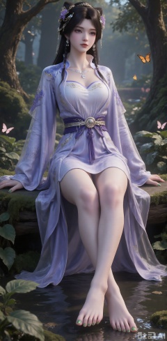 The image is a digital illustration of a young woman sitting on a mossy log in the forest. She was wearing a purple dress with intricate patterns and patterns, with her legs crossed in front of her. She was barefoot and her toenails were covered with green nail polish. She has long, loose wavy hair, and wears earrings and garlands. The background is tall trees and dense green plants, and a few butterflies are flying around her. The overall atmosphere of this picture is quiet and peaceful.Facial features are extremely clear