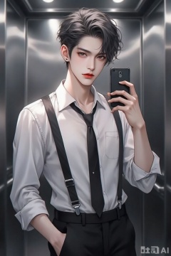 this is a digital drawing in an anime style depicting a young man with pale skin and black, tousled hair, he is taking a selfie in a metallic elevator, holding a smartphone with a black case in his right hand, he wears a white, slightly sheer, button-up shirt that reveals the contours of his chest and black suspenders with a black tie, his left hand rests on his hip, and he has a serious expression with red lips, the background is composed of shiny, vertical elevator walls, the overall color palette is monochromatic with shades of black, white, and gray, creating a sleek, modern look