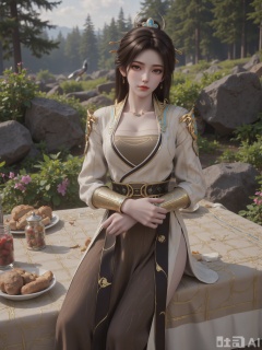 Super realistic and beautiful romantic illustrations, rich details show exquisiteness. She sits elegantly on the picnic lace cloth. The background is a picnic open space deep in the quiet forest. The huge rocks covered by ancient moss (a few bushes of lily lily of the valley flowers grow beige plaid picnic cloth (on the cloth is placed with glass jars of strawberry jars, whole wheat bread, and stone pottery vases with wild flowers). In the distance, squirrels poke their heads on the pine branches (fine sunlight leaks between the pine branches), birds singing and the sound of the breeze blowing through the leaves are intertwined. The whole scene exudes a natural poetic and literary relaxation, highlighting the harmonious integration of her aesthetics of life and the secret realm of the forest.
