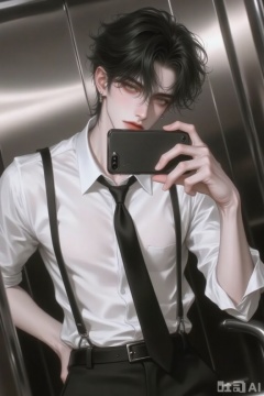 this is a digital drawing in an anime style depicting a young man with pale skin and black, tousled hair, he is taking a selfie in a metallic elevator, holding a smartphone with a black case in his right hand, he wears a white, slightly sheer, button-up shirt that reveals the contours of his chest and black suspenders with a black tie, his left hand rests on his hip, and he has a serious expression with red lips, the background is composed of shiny, vertical elevator walls, the overall color palette is monochromatic with shades of black, white, and gray, creating a sleek, modern look