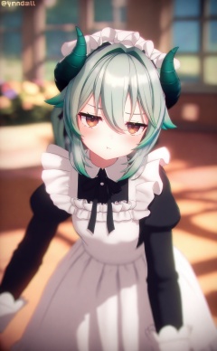 masterpiece,absurdres,best quality,loli,petite,high quality,chromatic_aberration,//,1girl, horns, solo, apron, maid, long_sleeves, juliet_sleeves, looking_at_viewer, dress, :i, hair_between_eyes, maid_apron, white_apron, puffy_sleeves, blurry_background, black_dress, blurry, black_ribbon, brown_eyes, closed_mouth, animal_ears, twitter_username, collared_dress, pout, window, maid_headdress, curled_horns, bush, jitome, depth_of_field, ribbon, empty_eyes, blush, frilled_apron, demon_horns, grey_hair, indoors, neck_ribbon, :t, frills, green_hair, black_bow, white_flower, flower, rose, enmaided, artist_name, leaning_forward, alternate_costume, photo_background, black_horns, red_eyes, virtual_youtuber, sidelocks, day, short_hair, bow, expressionless, standing, holding, garden, long_hair//,Depth of field,(colorful),hdr,Tyndall effect,depth of field,Tyndall Effect,blurry,blurry_background,depth_of_field,bokeh,glowing,//,<lora:MMDguangwuran2——【noob】hans:1.15>,