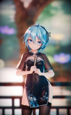 masterpiece,absurdres,best quality,loli,petite,high quality,chromatic_aberration,//,1girl, solo, chinese_clothes, dress, thighhighs, blue_hair, hand_fan, short_hair, china_dress, blue_eyes, folding_fan, looking_at_viewer, floral_print, holding_fan, holding, black_thighhighs, folded_fan, blurry, strapless, blurry_background, leaning_on_object, breasts, hair_between_eyes, black_dress, short_dress, strapless_dress, smile, hairband, shrug_\(clothing\), ahoge, headset, railing, depth_of_field, blue_dress, flower, headphones, standing, lace_trim, cowboy_shot, side_slit, covered_navel, see-through, closed_mouth//,Depth of field,(colorful),hdr,Tyndall effect,depth of field,Tyndall Effect,blurry,blurry_background,depth_of_field,bokeh,glowing,//,<lora:MMDguangwuran2——【noob】hans:1.15>,