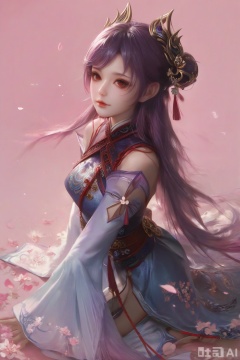 score_9,score_8_up,score_7_up,1girl,solo,looking at viewer,long hair,purple hair,hair ornament,red eyes,dress,detached sleeves,lips,Cherry Blossoms,petals,pink background,pink theme,facing viewer,faceoff,happiness,chinese clothes,kneeling on liquid