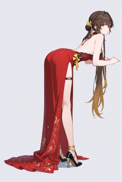 An illustration of Sushang from *Honkai: Star Rail*: She wears a red backless gown with a high side slit and heels, keeping her signature braid and yellow bow. Leaning forward, she showcases graceful curves, reimagining the valiant swordsman as a sexy vision.