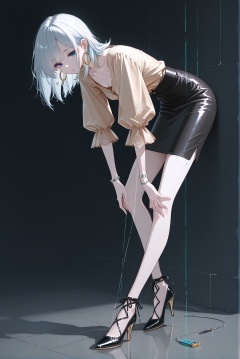 A girl in a standing position, , aquamarine, matte burgundy pencil skirt, soft ivory blouse with hidden microcircuit thread, thin platinum wristband, lace-up patent pumps, tiny hoop earrings,
