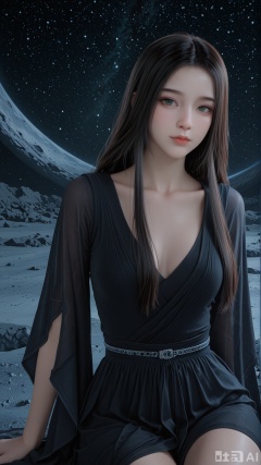 1girl, solo, YY clothes, on moon, exquisite skin, cowboy_shot, yokozuwari, looking at viewer, even illumination, very awa, starry sky background,