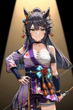 <lora:Narita_Brian:0.8>,narita brian \(umamusume\),horse ears,yellow eyes,long hair,horse girl,ponytail,black hair,horse tail,bangs,tail,hair between eyes,narita brian \(heavenly laughter kaburaya\) \(umamusume\),official alternate costume,ear ornament,bandaid on nose,single sleeve,single bare shoulder,detached sleeves,asymmetrical sleeves,chest sarashi,japanese clothes,asymmetrical clothes,obi,sash,long sleeves,purple kimono,strapless,floral print,rope,shimenawa,shorts,holding bow \(weapon\),, 1girl,solo,smile,looking at viewer,cowboy shot,pose,spotlight,
