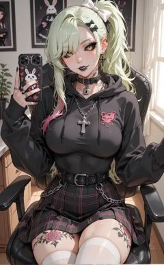 <lora:Mega_Fluffy_IL:0.5> lazypos, masterpiece, best quality, ultra-detailed, amazing quality, very aesthetic, illustration, newest, billyhhyb:0.3,<lora:Full_body_Tattoo_by_Stable_Yogi_ILLUS_10_V1:1> 1girl, long hair, single ponytail, asymmetrical bangs, asymmetrical sidelocks, (light green hair, dark pink highlights), tsurime eyes, green eyes, slit pupils, colored sclera, (black sclera), black nail polish, eyeliner, black eyeshadow, black lips, vampire fangs, mature female, medium breasts, toned female, thick thighs, jewelry, cross earring, collar, labret ring, (lip ring), eyebrow piercing, vine tattoo, tattooed body, goth fashion, (rabbit_hood), hood_down, belt, belt_collar, black_belt, black_skirt, black_sweater, bow, cellphone, chain, chain_necklace, cross, cross_hair_ornament, cross_necklace, emo_fashion, hair_bow, hair_ornament, hair_over_one_eye, holding, holding_phone, indoors, lock, necklace, o-ring, padlock, phone, piercing, plaid_clothes, plaid_skirt, selfie, skirt, sleeves_past_wrists, tall boots, goth boots, smartphone, sweater, swivel_chair, white_bow, white thighhighs,