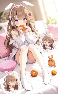 masterpiece,very aware,highres,absurdres,newest,best quality,loli,petite,high quality,chromatic_aberration,cinematic_angle,dutch angle,blurry_foreground,A light gradient background with white on top and brown at the bottom,//,1girl,animal ears,brown hair,hair ornament,long hair,purple eyes,rabbit ears,hair bun,socks,fake animal ears,jacket,holding,double bun,off shoulder,shorts,very long hair,sitting,white jacket,open clothes,white shorts,headphones,open jacket,food,long sleeves,knees up,strap slip,chibi,closed mouth,crescent hair ornament,bangs,bare shoulders,frills,crescent,closed eyes,camisole,short shorts,no shoes,pillow,virtual youtuber,game controller,rabbit hair ornament,holding food,looking at viewer,hairclip,eating,white socks,blush,frilled pillow,bloomers,underwear,multiple views,puffy long sleeves,puffy sleeves,full body,white bloomers,//,//,official art,blurry background,depth of field,detailed light,best shadow,shiny skin,cinematic lighting,ray tracing,amazing quality,very aesthetic,absurdres,beast quality,ultra detailed,newest,8K,HDR,full_shot,//,<lora:lora:1>,