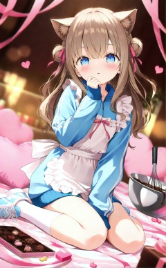 masterpiece,very aware,highres,absurdres,newest,best quality,loli,petite,high quality,chromatic_aberration,cinematic_angle,dutch angle,blurry_foreground,A light gradient background with white on top and brown at the bottom,//,1girl,solo,animal ears,apron,chocolate,brown hair,wariza,long hair,sitting,holding,blue eyes,jacket,looking at viewer,sleeves past wrists,long sleeves,frilled apron,valentine,shoes,white apron,frills,blush,socks,food,candy,white socks,cat ears,heart,animal ear fluff,blue jacket,ribbon,bangs,chocolate bar,track jacket,plaid,box,hair ribbon,mixing bowl,sneakers,white footwear,hand up,hair bun,bowl,parted lips,pink ribbon,whisk,blue footwear,//,//,official art,blurry background,depth of field,detailed light,best shadow,shiny skin,cinematic lighting,ray tracing,amazing quality,very aesthetic,absurdres,beast quality,ultra detailed,newest,8K,HDR,full_shot,//,<lora:lora:1>,