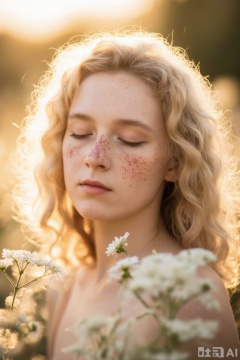 A photograph of a young woman with fair skin and curly blonde hair, closed eyes, and freckles on her cheeks. She is surrounded by white wildflowers, bathed in warm, golden sunlight. Her expression is serene and contemplative. The background is softly blurred, emphasizing her peaceful, ethereal beauty.,High-definition picture quality