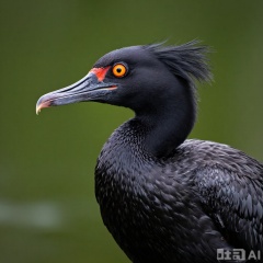 A photograph of a black cormorant with striking orange eyes and a distinctive tuft of feathers on its head. The bird's glossy, wet feathers glisten against a blurred dark green background, emphasizing its sleek, streamlined body and sharp beak. The image captures the bird's intense gaze and intricate feather details.