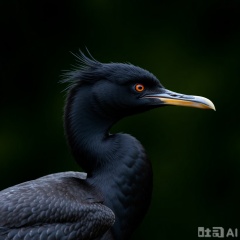 A photograph of a black cormorant with striking orange eyes and a distinctive tuft of feathers on its head. The bird's glossy, wet feathers glisten against a blurred dark green background, emphasizing its sleek, streamlined body and sharp beak. The image captures the bird's intense gaze and intricate feather details.