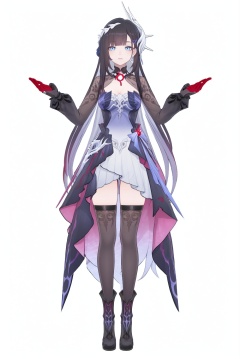 8k,best quality,masterpiece,(ultra-detailed),(high detailed skin),(by nanoless, by misumi \(macaroni\),:0.5),A full-body portrait of a young girl,standing gracefully,pastel art style,high-key lighting,shoujo manga influence,hd quality,delicate details,full body,full shot,standing,looking at viewer,(solo:1.2),simple background,(white background:1.2),<lora:Cerydra-Hysilens-sd-Tanger:0.8>,Hysilens \(Honkai: Star Rail\),silver face scale,1girl,long hair,blue eyes,black hair,Hysilensdef hair ornament,bangs,breasts,clothes: Hysilensdef white-and-black dress,Hysilensdef thighhighs,Hysilensdef mismatched gloves,long sleeves,torn thighhighs,black left glove,red right glove,