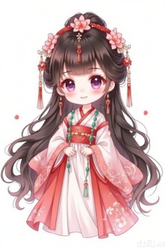 This is a digital illustration in a cute anime style. In the picture, there is a young girl with big and expressive purple eyes, long and wavy black hair, and pink flowers, red ribbons and small tassels decorating her head. She is wearing a traditional pink and white kimono with exquisite floral patterns and green beads. Her small hands gently hold the hem of the kimono. The background is pure white, creating a delicate and dreamy atmosphere. The girl's cheeks are slightly flushed, she has a gentle and innocent smile, and the overall color combination is soft and elegant, enhancing the charming and dreamy feeling of the illustration.